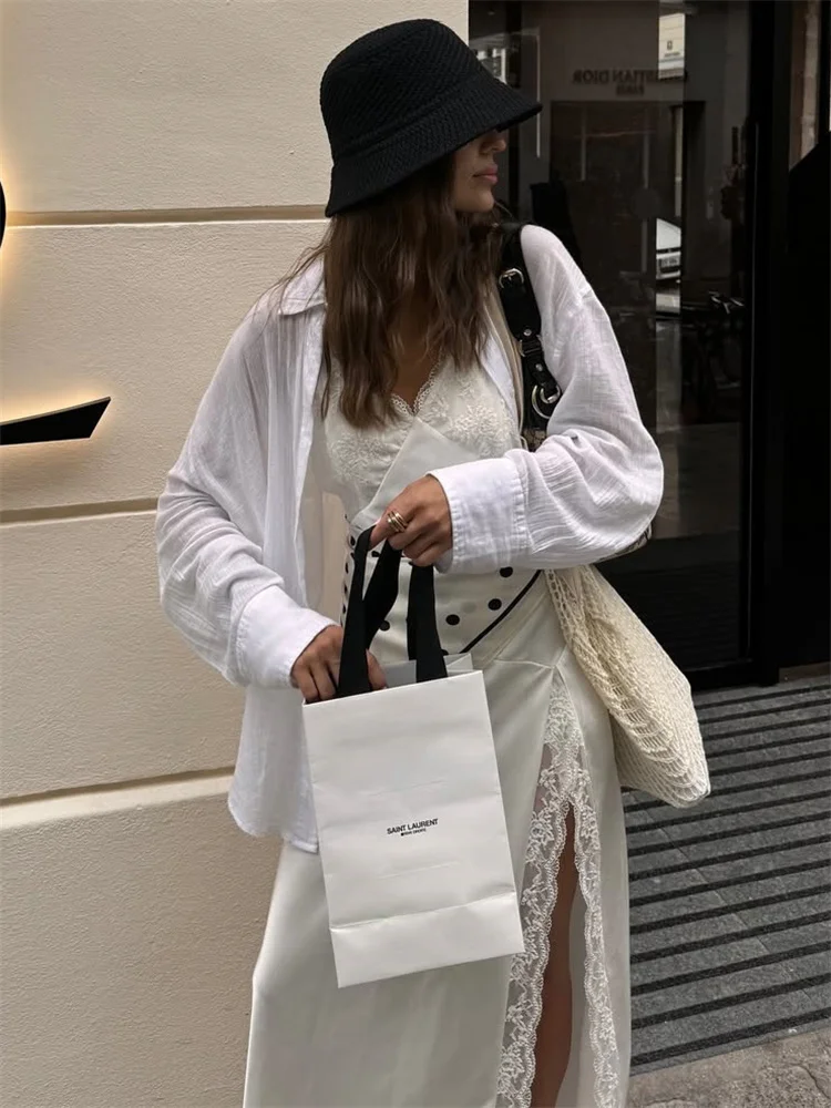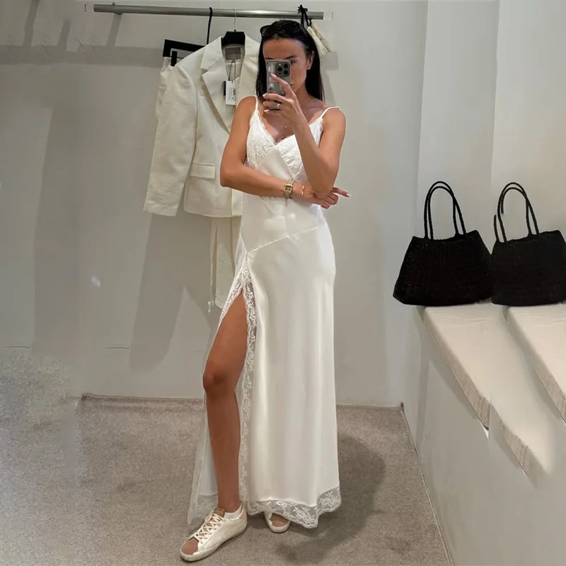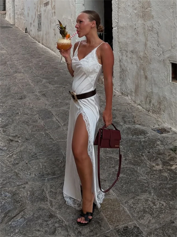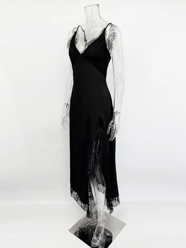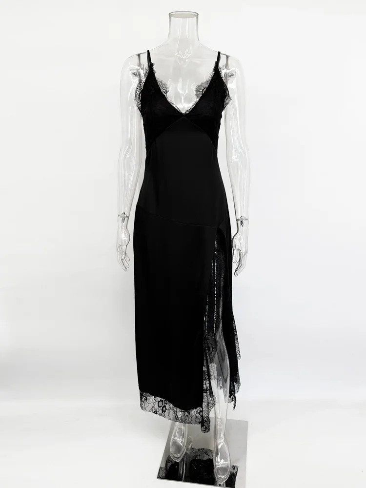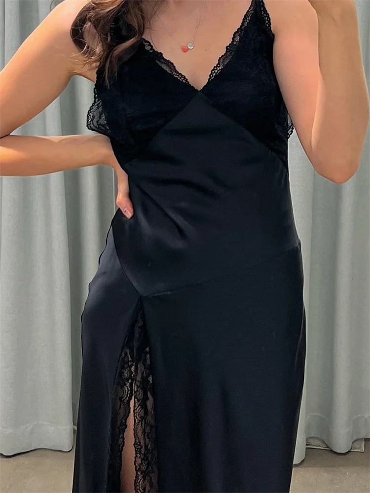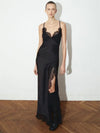 With thin straps and delicate lace trim, it combines sensuality and elegance in a balanced way. The flowing cut follows the body naturally, while the front slit adds movement and presence — without excess, just the right amount.